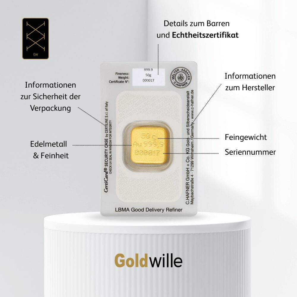 Im Gegensatz zu vielen anderen Goldraffinerien fertigt C.Hafner seine Gold-Gussbarren in einer eigenen Werkstatt und verwendet dabei ausschließlich Sekundärmaterialien. Das bedeutet, dass die verwendeten Rohstoffe bereits zuvor im Umlauf waren und einer Wiederverwendung zugeführt werden. Der LBMA Good-Delivery-Status garantiert dabei höchste Reinheit des Goldes. Robuste Blisterverpackungen sorgen für den optimalen Schutz der Goldbarren und ermöglichen einen uneingeschränkten weltweiten Handel. Jede Verpackung enthält ein Echtheitszertifikat und eine spezielle Folie, die sich milchig verfärbt, sobald der Blister beschädigt wird.