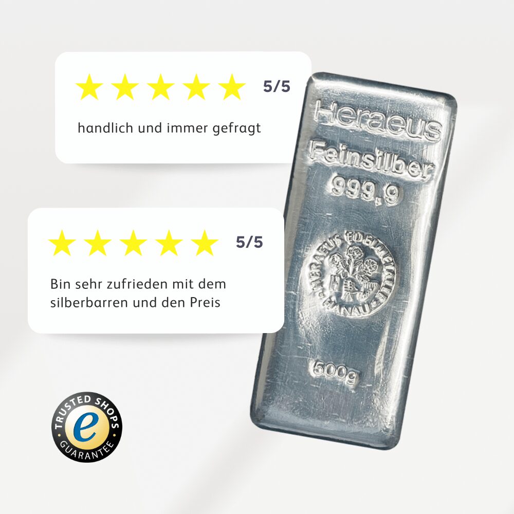 Die Entscheidung, in 1000 g Silber zu investieren, könnte ein kluger erster Schritt sein, um Ihre finanzielle Zukunft zu sichern. Silber hat sich über Jahrtausende als wertbeständiges und krisensicheres Investment bewährt, und viele Experten empfehlen es als Teil einer diversifizierten Anlagestrategie. Es dient nicht nur als Absicherung gegen wirtschaftliche Unsicherheiten, sondern bietet auch eine solide Wertsteigerung über die Zeit, insbesondere in Zeiten von Inflation und Marktvolatilität. Der 1 kg Silberbarren von Heraeus ist dabei eine exzellente Wahl. Die hohe Feinheit und die renommierte Herkunft garantieren, dass Sie ein Produkt von höchster Qualität erhalten.
