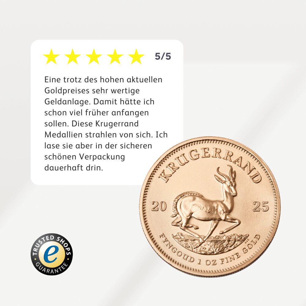 Die Entscheidung, in 1 oz Gold zu investieren, könnte ein kluger erster Schritt sein, um Ihre finanzielle Zukunft zu sichern. Gold hat sich über Jahrtausende als wertbeständiges und krisensicheres Investment bewährt, und viele Experten empfehlen es als Teil einer diversifizierten Anlagestrategie. Es dient nicht nur als Absicherung gegen wirtschaftliche Unsicherheiten, sondern bietet auch eine solide Wertsteigerung über die Zeit, insbesondere in Zeiten von Inflation und Marktvolatilität. Die 1 oz Krügerrand Goldmünze ist dabei eine exzellente Wahl. Die hohe Feinheit und die renommierte Herkunft garantieren, dass Sie ein Produkt von höchster Qualität erhalten.