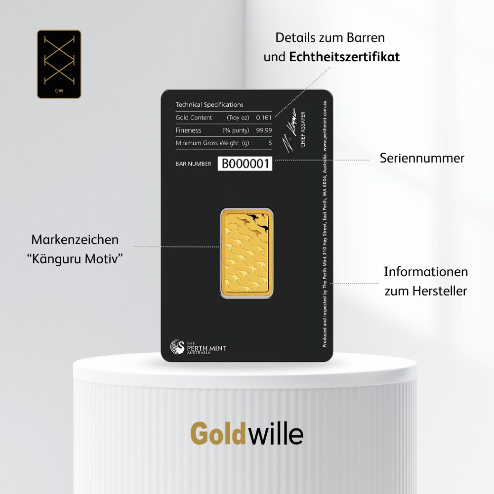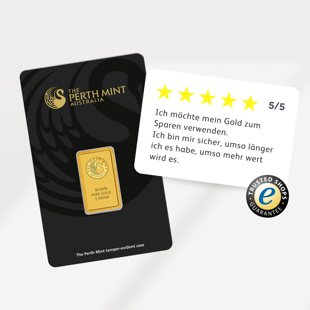 Seit ihrer Gründung setzt The Perth Mint stets hohe Standards in der Goldverarbeitung. Mit ihrer LBMA-Zertifizierung und der staatlichen Kontrolle durch die Regierung Westaustraliens bietet sie Anlegern weltweit Sicherheit und Vertrauen. Durch ihre lange Geschichte und die ständige Innovation hat sie sich einen Namen gemacht, der für Qualität und Beständigkeit steht. Wenn Sie sich für einen 5 g Goldbarren von The Perth Mint entscheiden, setzen Sie auf erstklassige Handwerkskunst und jahrzehntelange Erfahrung. Dieser Goldbarren kombiniert Qualität, Sicherheit und ästhetischen Wert und ist zudem eine hervorragende Wahl für jeden, der in Gold investieren möchte.