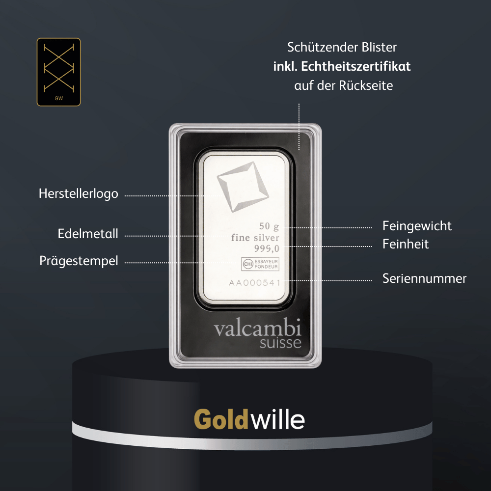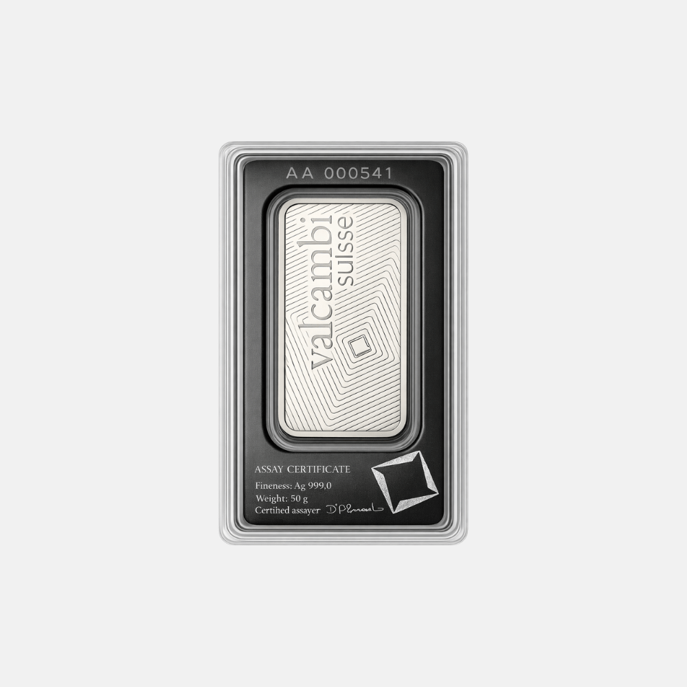 Der 50 g Silberbarren von Valcambi: Schweizer Präzision in reinem Silber