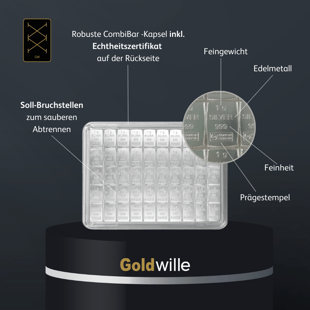 Dieses Tafelsilber verkörpert Perfektion in jeder Hinsicht. Mit einem Feinsilbergehalt von 999 / 1.000 sind diese Tafel-Silberbarren ein Produkt der renommierten Valcambi SA, einer der führenden Goldraffinerien weltweit. Diese schweizerische Manufaktur ist bekannt für ihre herausragende Qualität und ihre LBMA-Zertifizierung, die höchste Standards garantiert. Die robuste Blisterverpackung gewährleistet den Schutz der Silberbarren und beinhalten außerdem ein Echtheitszertifikat, das die Authentizität des Edelmetalls bestätigt. Dank seiner Perforation lassen sich die einzelnen Barren leicht voneinander trennen ohne an Wert zu verlieren.